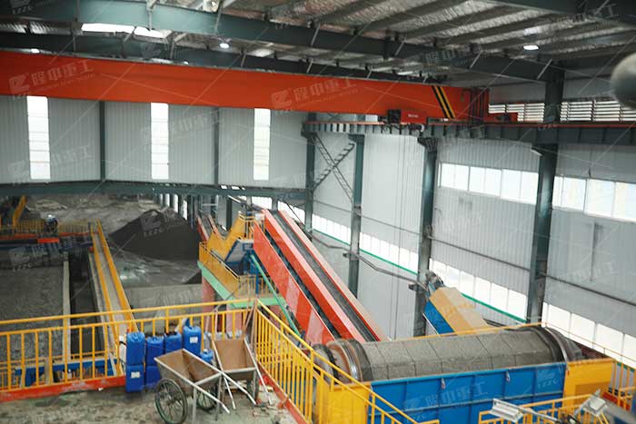 通過鏟車從爐渣庫房處鏟出爐渣,把料裝入料斗,再用輸送帶送入滾筒進行篩分,分出大小料。